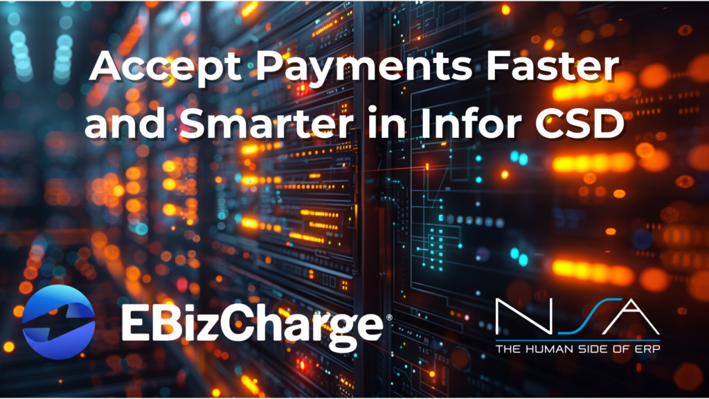Join NSA and EBizCharge for a webinar to explore how Infor CloudSuite Distribution (CSD) users are accepting payments natively in CSD, streamlining AR workflows, and making CSD work harder for them. We’ll explore all-in-one billing tools, automation, security, and learn how EBizCharge’s native Infor CSD payment solution can help you.